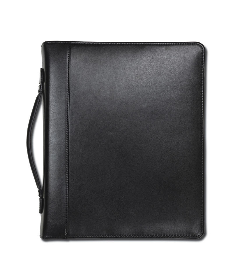 This Leather Zipper Padfolio is a unique organization tool designed for those that want to get noticed. This executive padfolio combines style and functionality to work as a versatile business partner. Designed to perfection, this zipper padfolio is crafted using superb quality durable black leather with hand-stitched edge detailing for a classic look. The gender-neutral black leather exterior looks great & feels nice too, but more importantly, it will stand the test of time. The inside of this business padfolio is packed with pockets where you can store and organize all your extra digital accessories, documents, business cards, and other business accessories. The interior lined pocket with hook and loop closure lets you store your iPad or most tablets up to 10.1 inches. The expandable document pocket provides convenient space to store loose papers. The zippered pocket keeps confidential documents or small media items like flash drives, CDs/DVDs, coins, keys, etc. safely, and business card pockets ensure easy and quick access. This business case is equipped with a 1-inch round ring bonder that can comfortably hold up to 225 paper sheets. The wrap-around zipper closure ensures safety of all your digital and paper contents in office or when you are on the go. Comes with convenient and comfortable spine mounted handle that can be retracted to reduce the case size when required. Whether carrying to a meeting or on your commute, this portfolio will fit nicely in your hand and make transportation a breeze.