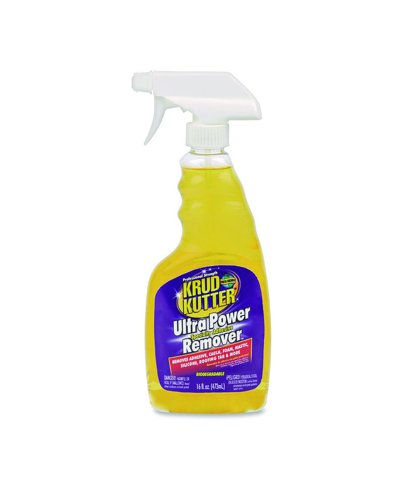 Krud Kutter Ultra Power Specialty Adhesive Remover is designed to quickly remove adhesive, asphalt, blacktop, carbon black, caulk, diesel soot, duct tape, foam, fresh oil-based paint and stain, liquid insulation, liquid nails, mastic, road and roofing tar, silicone sealant, water seal and more. Ultra Power Specialty Adhesive Remover is effective on most surfaces. Not recommended on varnish, suede, leather, silk, rubber or elastic items.
