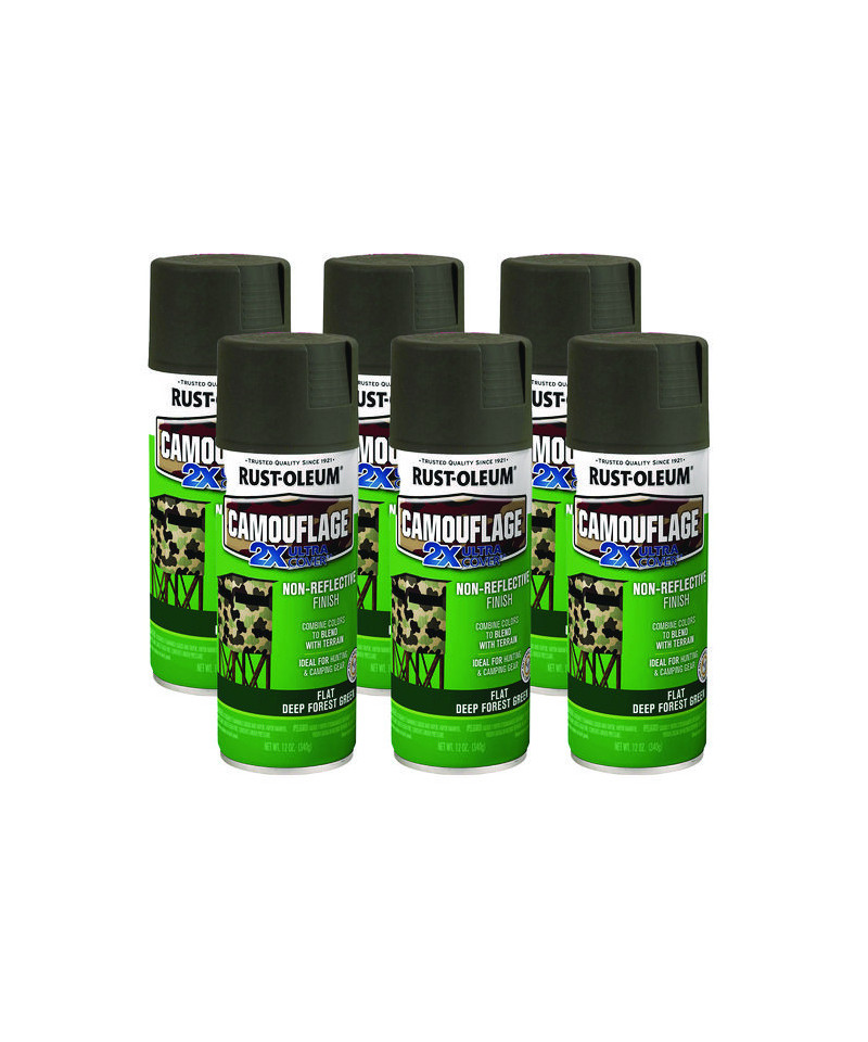 Rust-Oleum Camouflage Spray Paint provides a non-reflective, ultra flat finish for maximum hiding on interior or exterior surfaces. Fast drying camo spray paint offers quick transformation on surfaces, hunting gear, stencils and more. Camouflage Paint is ideal for sprinkler pipes, deer hunting and tree stands, outdoor wood and metal sheds, army and military-inspired vehicles, trucks and Humvees, four-wheelers, outdoor playground equipment, patio chairs, utility meters and electric boxes, fishing boats (topside only), shelves and furniture, accent walls and inside/outside structures, power tools, hunting gear and tackle boxes, paintball arenas, sports gear and scenic theatrical sets.