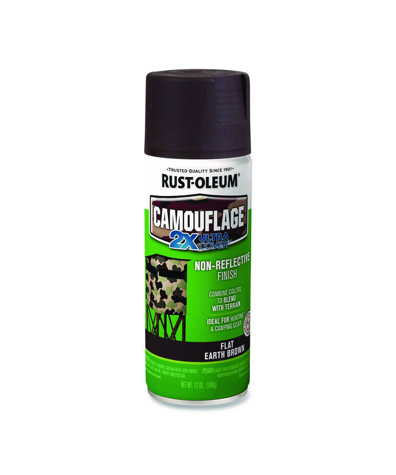Rust-Oleum Camouflage Spray Paint provides a non-reflective, ultra flat finish for maximum hiding on interior or exterior surfaces. Fast drying camo spray paint offers quick transformation on surfaces, hunting gear, stencils and more. Camouflage Paint is ideal for sprinkler pipes, deer hunting and tree stands, outdoor wood and metal sheds, army and military-inspired vehicles, trucks and Humvees, four-wheelers, outdoor playground equipment, patio chairs, utility meters and electric boxes, fishing boats (topside only), shelves and furniture, accent walls and inside/outside structures, power tools, hunting gear and tackle boxes, paintball arenas, sports gear and scenic theatrical sets.