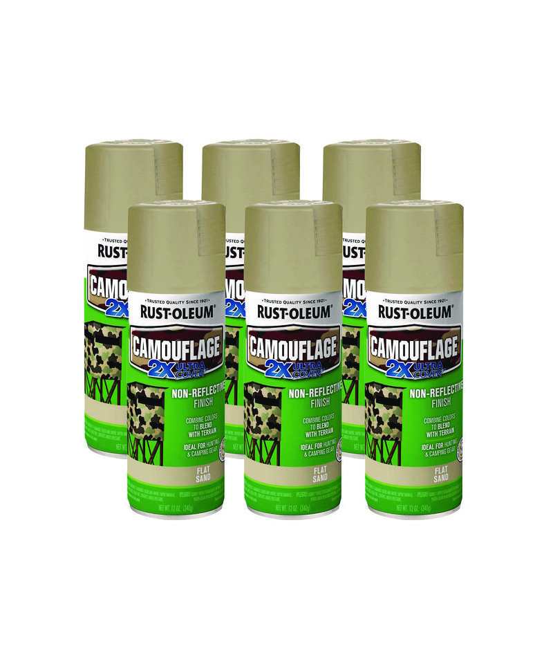 Rust-Oleum Camouflage Spray Paint provides a non-reflective, ultra flat finish for maximum hiding on interior or exterior surfaces. Fast drying camo spray paint offers quick transformation on surfaces, hunting gear, stencils and more. Camouflage Paint is ideal for sprinkler pipes, deer hunting and tree stands, outdoor wood and metal sheds, army and military-inspired vehicles, trucks and Humvees, four-wheelers, outdoor playground equipment, patio chairs, utility meters and electric boxes, fishing boats (topside only), shelves and furniture, accent walls and inside/outside structures, power tools, hunting gear and tackle boxes, paintball arenas, sports gear and scenic theatrical sets.