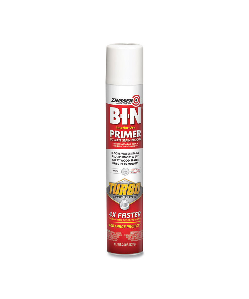 Get the speed and quality of professional spray systems without the hassle. BIN Aerosol Primer with Turbo Spray System combines the power of BIN primers with the speed and convenience of the Turbo Spray System. Always great for blocking stains and odors associated with water-, smoke- and fire-damage, BIN professional primers are uniquely suited for disaster restoration jobs. As they block odors from pets, mildew and cigarettes, they're perfect for a wider variety of specialty painting projects, too. For added versatility, they also employ shellac and rosin binders, which easily sand to a powder when dry, allowing BIN primers to double as excellent wood sealers. The proprietary Turbo Spray System delivers a wide, 10" spray pattern and four-times the output of traditional primer sprays, ensuring fast and easy full coverage. For best results, hold can upright 18 to 24 inches from the intended surface, and spray in a steady back-and-forth motion, slightly overlapping on each stroke.