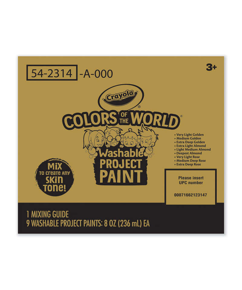 Express your creativity with this Crayola Colors of the World Washable Kids Paint Set in 9 resealable 8-oz bottles. This worry-free project paint provides hours of fun and cleans up easily. Children can choose from a range of skin tone paints created to mirror authentic skin colors. Designed to inspire, this pack of Crayola Multicultural Kids Paint is perfect for activities on diversity and self-awareness. Each washable color is specially formulated to wash cleanly from skin and most washable clothing. This paint set for kids is great to have on hand for school projects, crafts, and creative play. Pair with Crayola Colors of the World Crayons for even more creative, customized fun. Safe and nontoxic, ideal for children ages 3 and up.