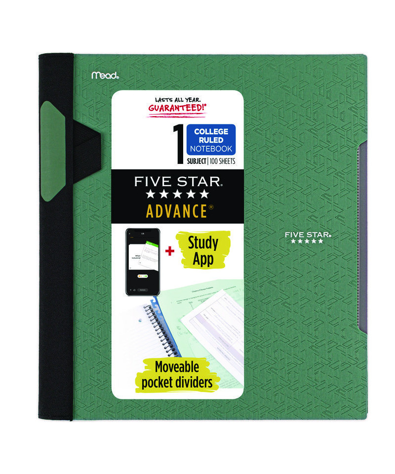 Lasts all year. Guaranteed! Scan, study and organize your notes with the Five Star App. Create instant flashcards and sync your notes to Google Drive to access them anywhere from any device. Rearrange the movable plastic dividers anywhere in your notebook to organize notes. Dividers with expanding pockets hold 8.5" x 11" handouts. Visible tabs from front cover make it easy to flip to any section. Spiral Guard covers the wire to help prevent snags on clothes and backpacks. Label your notebook on the writable spine, and keep your favorite pen or pencil handy in the pen loop. Guarantee is valid for one year from purchase date. Does not cover misuse.