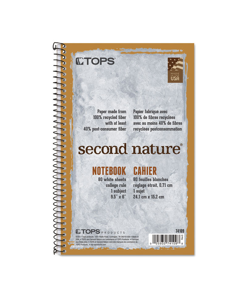 TOPS™ Second Nature® Recycled 1-Subject Notebooks have paper made from recycled fiber. A sturdy no-snag coil resists catching on backpacks, papers or clothing. Perforated sheets detach easily to keep your book neat and tidy.