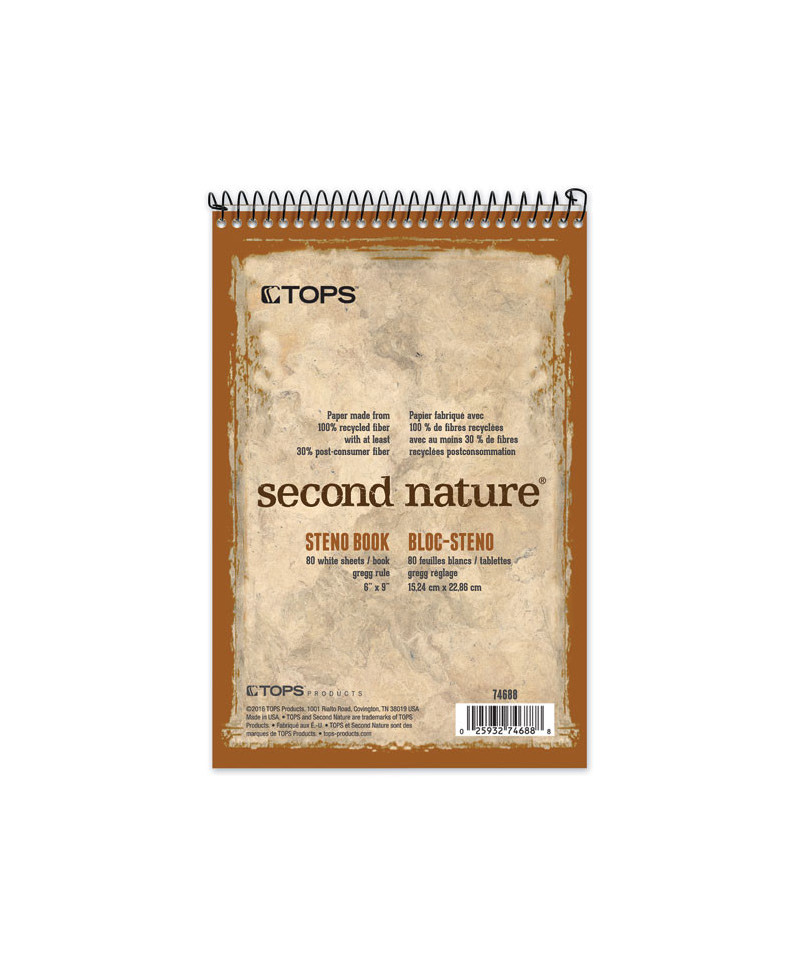 TOPS™ Second Nature® Reporter's Notebooks have paper made from recycled fiber. These classic coat-pocket sized 4" x 8" books fit the palm for fast, on-the-go note taking. Books flip open to thick, double-sided sheets. A sturdy cover and back provide firm support for writing.