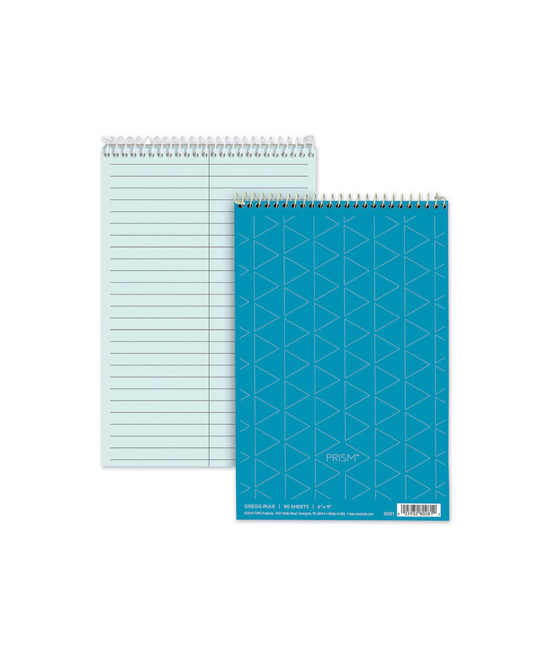 TOPS Prism Steno Books come in soft colors to brighten up your writing routine. The classic flip-top format gives quick access to notes and lists. A sturdy back provides firm writing support. No-snag coil. Perforated sheets.