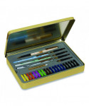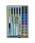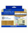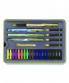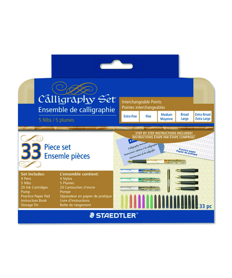 Master the Art of Calligraphy with Staedtler®. This comprehensive set contains everything you need to learn and develop your copperplate calligraphy skills and Spencerian penmanship. In addition to the pens, this versatile set includes a fountain-pen instructions guide, a step-by-step lettering workbook with a practice pad for honing your skills, a full set of interchangeable fountain-pen nibs, a liquid-ink pump and an assortment of liquid-ink cartridges in a range of colors. Delivering enhanced ergonomics, its included nibs also feature rubberized grips for writing comfort. A sturdy and attractive metal case keeps the whole set together, ensuring easy storage and convenient portability.