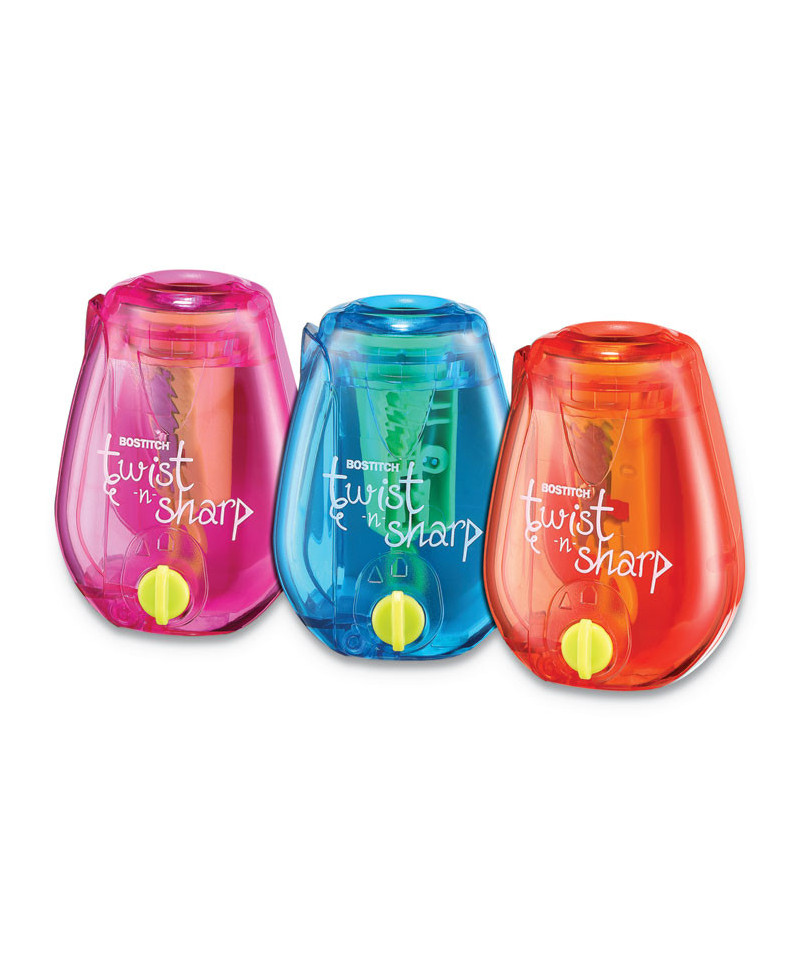 Twist-n-sharp two-hole pencil sharpener features ratchet technology in the sharpener for easy sharpening. The ratchet allows for faster sharpening without ever having to let go of the pencil. This technology is only offered on stitch premium office supplies. This sharpener also offers the convenience of two different sized holes so you can sharpen standard pencils as well as jumbo pencils! So even as your child transitions from learning pencils to standard pencils, your sharpener can remain the same! For products you can rely on, there's always Bostitch® Office!