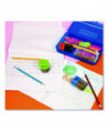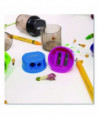 Double blades sharpener accommodates regular and oversized pencils and crayons. High-quality carbon steel blades. Less breakage of lead for extra sharp pencil. Plastic, non-toxic shell is easy to hold. Shavings receptacle for convenient disposal.