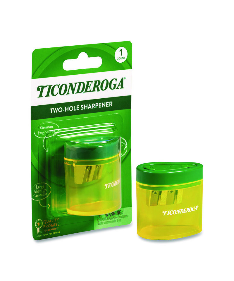 The World's Best Pencil® Company now brings you a best-in-class German-engineered pencil sharpener! Cheap sharpeners can break easily, over-sharpen pencils, and break tips resulting in unnecessary pencil waste. The Ticonderoga® pencil sharpener is German-engineered, with quality metal blades that sharpen cleanly and with ease. The ergonomic shape also fits well in-hand making it the best choice for supporting your writing, drawing, and creative needs.