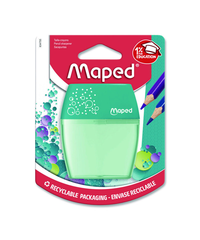 Keep your pencils sharp with the Maped Shaker Two-Hole Canister Pencil Sharpener. Featuring two high quality steel blades, this classic sharpener makes it easy to sharpen any standard or jumbo-sized pencils to a precise tip. Transparent, shatter-resistant construction makes it easy to see when you have to empty the integrated shavings canister. Perfect for school, the curved compact shape of the Shaker sharpener is easy to hold and is a great addition to any pencil case or bag.