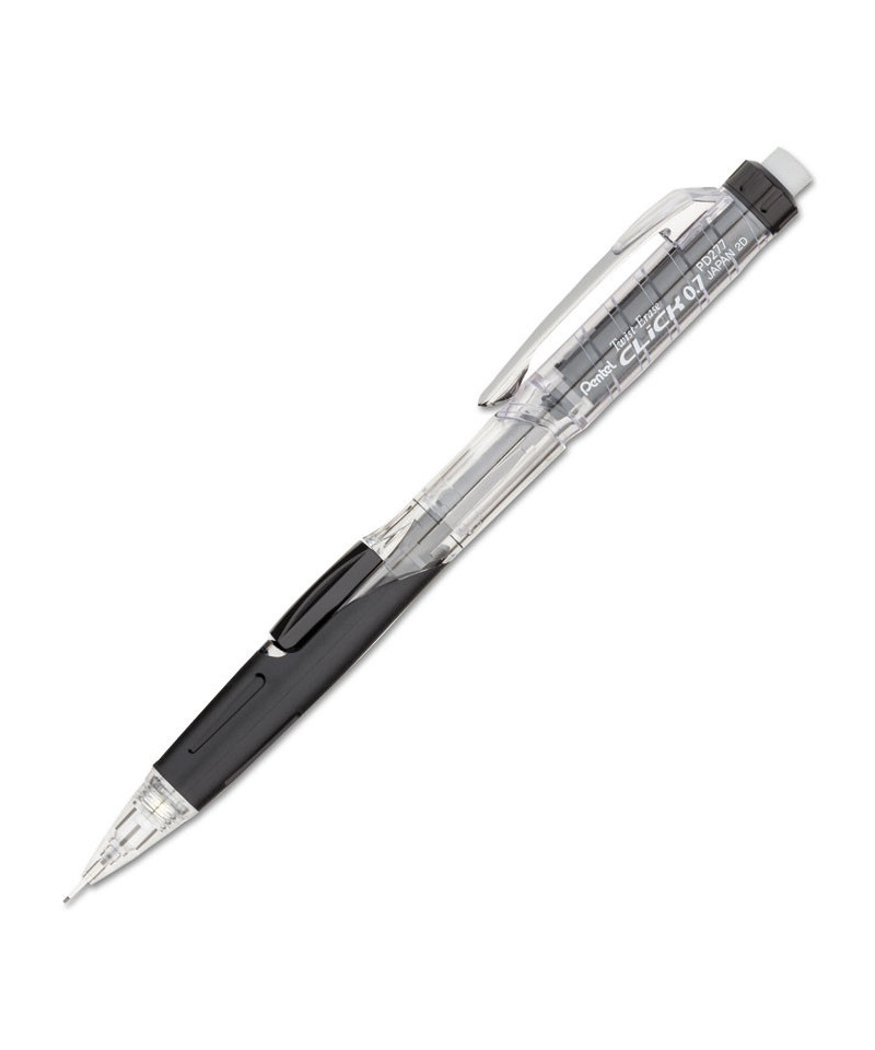 The Pentel® Twist-Erase® Click™ pencils now have new clear barrels with color accents for a stylish twist on pencils. Quick-click side button advances lead without interrupting your writing. Mistakes are no match for the larger-than-ordinary and long-lasting twist-up eraser. Cleanly erase any mistakes no smudges, no paper tears and no ghosts. The comfortable, extra-soft latex-free grip reduces writing fatigue. Pre-loaded with Pentel® Super Hi-Polymer® HB lead that never needs sharpening is super strong and produces a clear dark line.