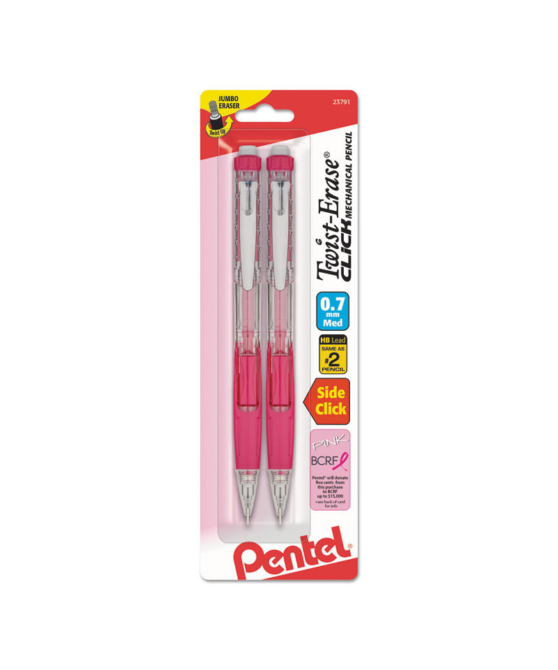 The Pentel® Twist-Erase® Click™ pencils now have new clear barrels with color accents for a stylish twist on pencils. Quick-click side button advances lead without interrupting your writing. Mistakes are no match for the larger-than-ordinary and long-lasting twist-up eraser. Cleanly erase any mistakes no smudges, no paper tears and no ghosts. The comfortable, extra-soft latex-free grip reduces writing fatigue. Pre-loaded with Pentel® Super Hi-Polymer® HB lead that never needs sharpening is super strong and produces a clear dark line.