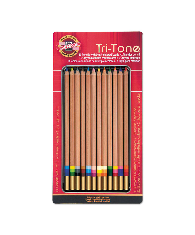 Create rich drawings with more depth than with traditional colored pencils. Each pencil contains three shades and draws a multi-colored line. Colors can even be blended further for more subtleties with a special blender pencil. Each set contains 11 colored pencils and a blender pencil. Pencils are protected in decorative tin.