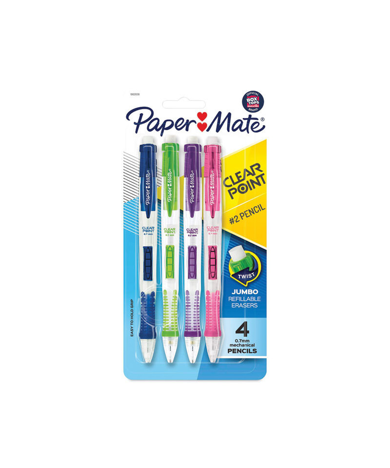 The Paper Mate Clearpoint Mechanical Pencil is a precise, fully-featured writing instrument that is ideal for standardized tests, drafting, and homework. These pencils feature a convenient side-click advance mechanism on the barrel that advances the lead with just a click. The textured over-molded grip provides comfort and control during long writing sessions, while the jumbo twist-up eraser lets you easily correct mistakes without any smudges or tearing.