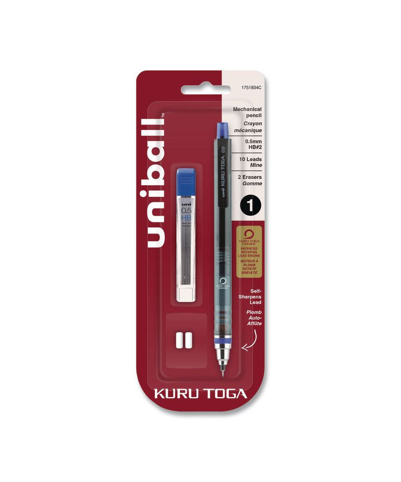 Bid farewell to dull writing and frequent lead breakage with the Kuru Toga Mechanical Pencil from uni-ball. Kuru Toga's self-sharpening lead engine ensures lead is always sharp and precise. This mechanical pencil's fine point delivers crisp and precise lines, so it's useful for a wide variety of drawing and writing tasks, including architectural drafting, sketching or taking down notes. Extra-durable diamond-infused lead creates dark, crisp lines allowing for more intricate writing while reducing lead breakage. Reusable and refillable. The pencil comes with replaceable erasers to clean up any mistakes. Grab the Kuru Toga mechanical pencil and be ready for whatever writing or drawing needs come your way.