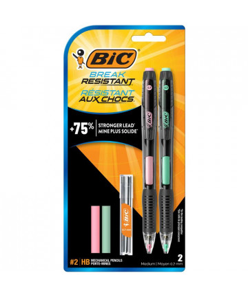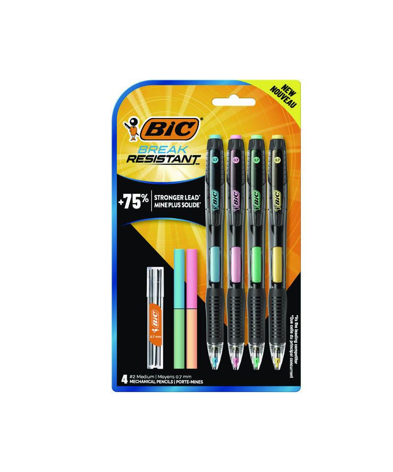 No more broken leads. Enjoy a smooth, uninterrupted writing experience with the BIC Break-Resistant mechanical pencils, thanks to the specially formulated 0.7 mm lead and an innovative shock-absorption mechanism that has a 75% stronger lead. Stronger lead means less breakage-so you can write with less time spent clicking for more lead. Crafted with thoughtful design from top to bottom, the BIC Break-Resistant mechanical pencil is the tool for any type of writing from jotting down a simple shopping list to composing long-form letters, drafting professional documents to taking standardized tests, and everything in between. Avoid the frustration of flimsy lead that snaps easily and requires constant replacement with these pencils that go the distance and last as long as your inspiration. Pencils feature a contoured grip that gives you the comfort you need to enjoy a long or short writing session.