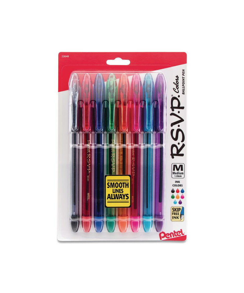 Make your everyday writing tasks stand out with Pentel® R.S.V.P.® Stick Ballpoint Pens. They write for nearly a mile! Featuring an extra-long barrel balanced for a superior writing experience, they're a high-ink-capacity favorite. Reliable tips lay down a consistent, skip-free line, while their Comfort Zone™ grips help you avoid writing fatigue. And as they feature a transparent design with color-coordinated flourishes, it's easy to grab the right color while you also monitor your remaining ink supply.