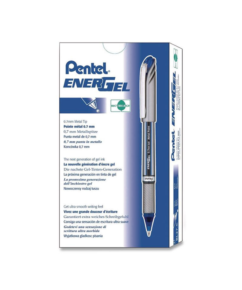 EnerGel NV Gel Pen, Stick, Medium 0.7 mm, Blue Ink, Gray/Black/Blue Barrel, Dozen