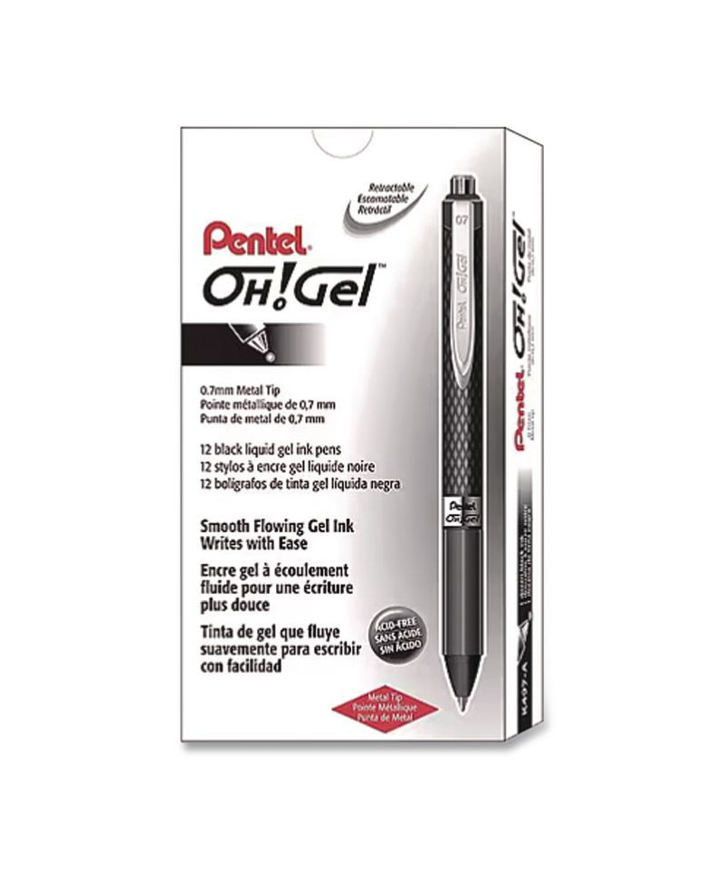 The Pentel® Oh! Gel retractable gel pen features acid-free, permanent gel ink that delivers a memorably smooth writing experience. The latex-free grip provides extended comfort and control when writing. The stylish carbon fiber look gives this pen unique appeal. It is available with a 0.7mm metal tip that writes medium lines.