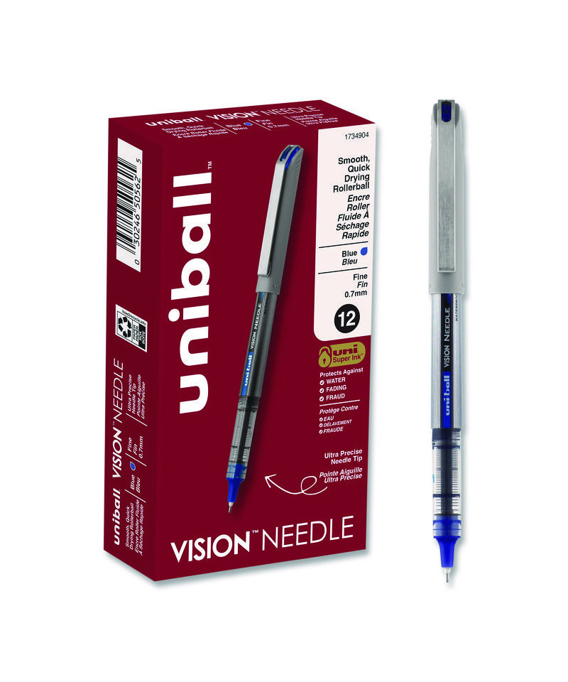Stock your office, home or classroom with Vision Needle Stick Rollerball Pens from uni-ball featuring a strong, long lasting 0.7 mm fine point. These needle point pens are designed with a bend resistant tip for better accuracy. Even-flowing, pigment-based roller ink delivers a smooth writing experience for reliably smooth, vivid lines and a rich color for improved clarity and readability. Use these fine point rollerball pens to create perfect letters, numbers and graphics. Innovative uni Super Ink technology effectively entraps the liquid ink into the paper, producing fraud, fade and water-resistant documents that resist check washing or bleaching. The 0.7mm fine needle point allows you to create ultra-precise, straight edge lines with ease. The exclusive Uni-Flow Ink System ensures a consistent, delightfully fluid writing experience, and a translucent window ensures that you don't run out of ink unexpectedly. Enjoy beautiful clean lines and give all of your ideas a burst of brilliant color with this classic style fine point rollerball pen.