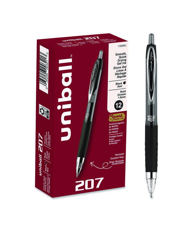 Stock your office, home or classroom with 207 Retractable Gel Pens from uni-ball with a stainless steel tip that resists bending and breaking. Even-flowing, pigment-based gel ink delivers a smooth writing experience for intense, vibrant lines, ensuring that every mark is brilliantly communicated. Use these retractable gel pens for everyday writing tasks, check signing and all of your important signatures, trusting its quick-drying uni Super Ink. Innovative uni Super Ink technology effectively entraps the gel ink into the paper, producing fraud, fade and water-resistant documents that resist check washing or bleaching. A textured grip offers greater comfort and control as you continue writing, while a translucent ink window indicates the level of gel ink remaining, so you don't run out unexpectedly. The sleek design of the 207 with modern metal accents gives the retractable gel pen a stylish touch.