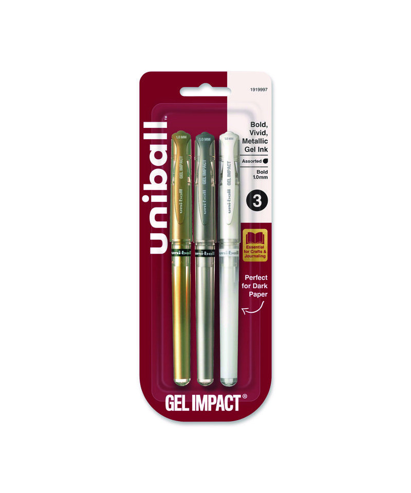 Inspire artistic interest as you easily embellish your writing and drawing. The shimmery shades of Signo Gel Impact Metallic Color Pens help your work stand out. Featuring a bold, thick and silky ink flow, Signo Gel Impact have a vibrancy that places them among the best pens for adding a pop of metallic flair. Their smooth-glide point and comfortable grip help you maintain precise control as you create, while making it easier to work longer whenever inspiration strikes. A quick-drying, acid-free ink formula and uni Super Ink technology ensure your marks are deeply entrenched into the paper for water- and fade-resistant, archival-safe results, making these pens ideal for decorating scrapbooks, journals, greeting cards... anything you want to last. If you're feeling adventurous, try them out for adding an artful twist to letters and envelopes or for elevating your important notes and bullet points to the next level. No matter how you choose to use them, Signo Gel Impact Metallic Color Pens deliver the right balance of vibrancy, performance and precision to meet your needs in any creative endeavor.