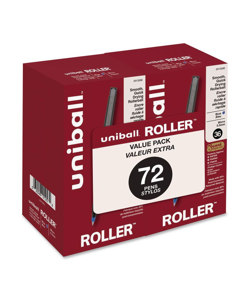 Stock your office, home or classroom with Roller Rollerball Stick Pens from uni-ball featuring strong, long lasting tips. These rollerball pens deliver the silky-smooth glide of a fountain pen without smudging for effortless writing. Roller pens produce neat and precise lines for intricate writing, making it easy to create super fine details in your drawings and diagrams. Capped roller pens are useful for a variety of tasks from note taking to signing checks and legal documents to uniquely embellishing fun and creative writing projects. Innovative uni Super Ink technology forms a strong bond with the paper, protecting from water, fading and fraud. Made from recycled material.