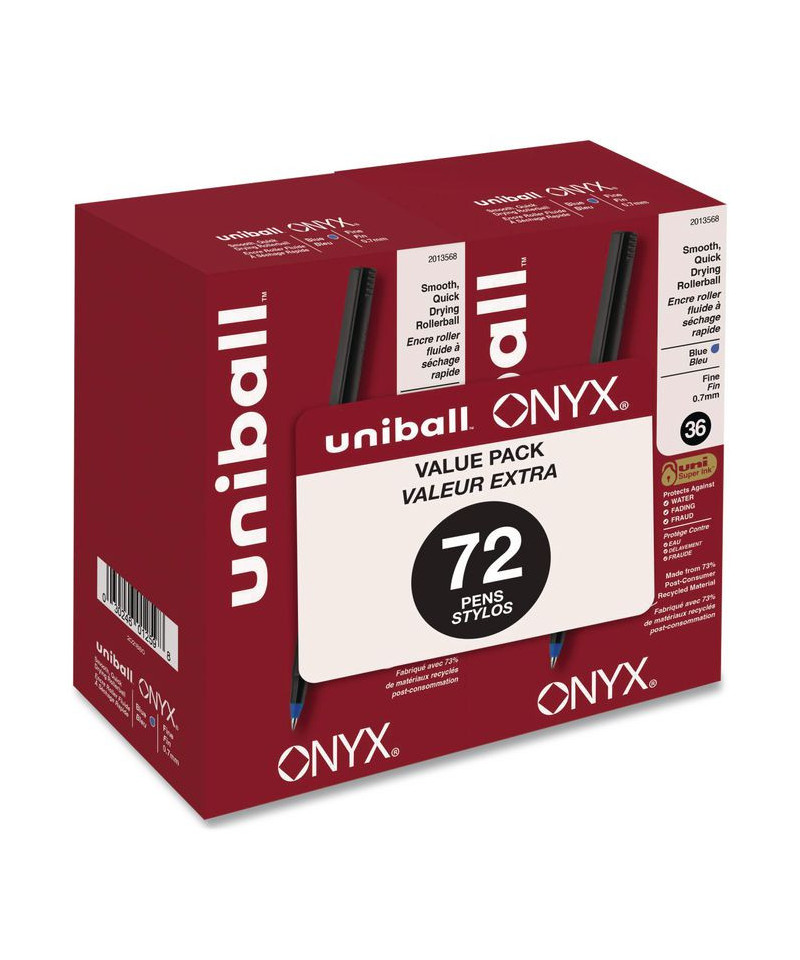 Stock your office, home or classroom with Onyx Rollerball Stick Pens from uni-ball featuring strong, long lasting tip sizes. This rollerball pen delivers the silky-smooth glide of a fountain pen without smudging for effortless writing. ONYX pens produce crisp and precise lines for intricate writing, making it easy to create super fine details in your drawings and diagrams. Capped roller pens are useful for a variety of tasks from note taking to signing checks and legal documents to uniquely embellishing fun and creative writing projects. Innovative uni Super Ink technology forms a strong bond with the paper, protecting from water, fading and fraud. A great economic and environmentally-conscious choice as this super sleek micro point roller pen is made from post-consumer recycled material.