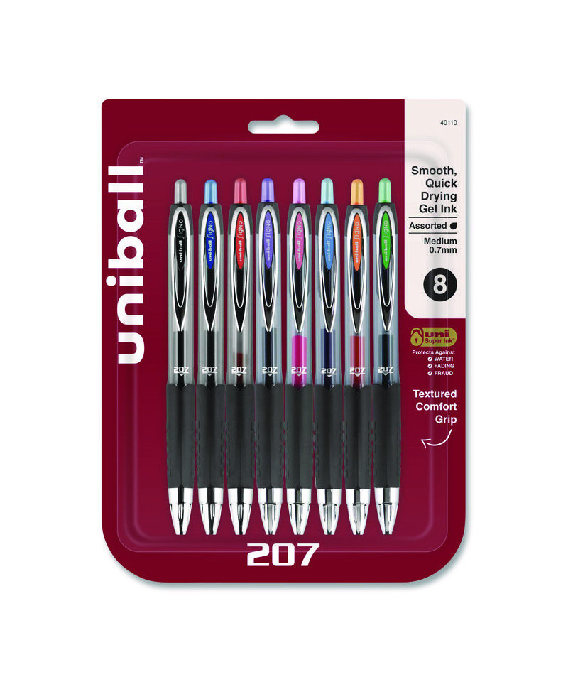 Stock your office, home or classroom with 207 Retractable Gel Pens from uni-ball with a stainless steel tip that resists bending and breaking. Even-flowing, pigment-based gel ink delivers a smooth writing experience for intense, vibrant lines, ensuring that every mark is brilliantly communicated. Use these retractable gel pens for everyday writing tasks, check signing and all of your important signatures, trusting its quick-drying uni Super Ink. Innovative uni Super Ink technology effectively entraps the gel ink into the paper, producing fraud, fade and water-resistant documents that resist check washing or bleaching. A textured grip offers greater comfort and control as you continue writing, while a translucent ink window indicates the level of gel ink remaining, so you don't run out unexpectedly. The sleek design of the 207 with modern metal accents gives the retractable gel pen a stylish touch.