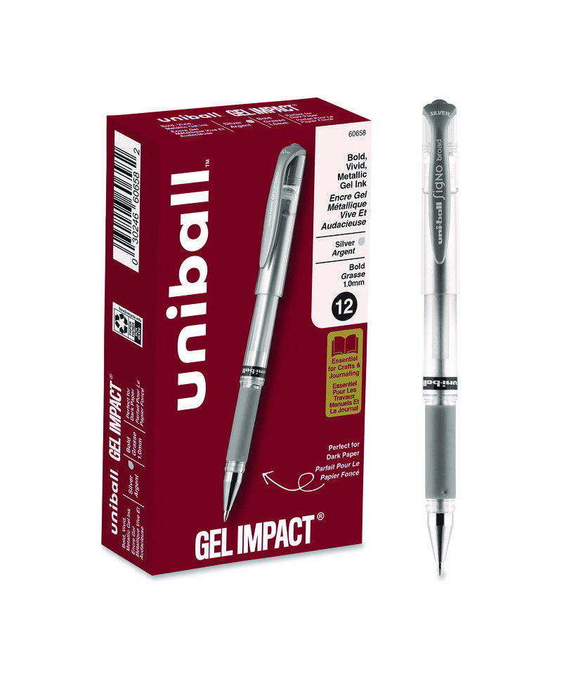 Make your writing or drawings stand out with vivid, silky smooth Signo Gel Impact pens from uni-ball featuring a 1.0mm bold point. With a variety of colors, these are the best gel pens to add a pop of metallic flair to your artistic and personal projects. The bold-point gel pens are acid free and fade resistant, so you can use them for scrapbooking, journaling, planner decorating or other projects that you want to last. Thanks to a comfortable rubber grip, you can maintain precise control as you create. Try metallic gel pens for an artful twist on envelopes and letters or to bring your bullet journal or planner to the next creative level. Gel Impact pens deliver the right balance of smoothness and precision for all your creative needs.
