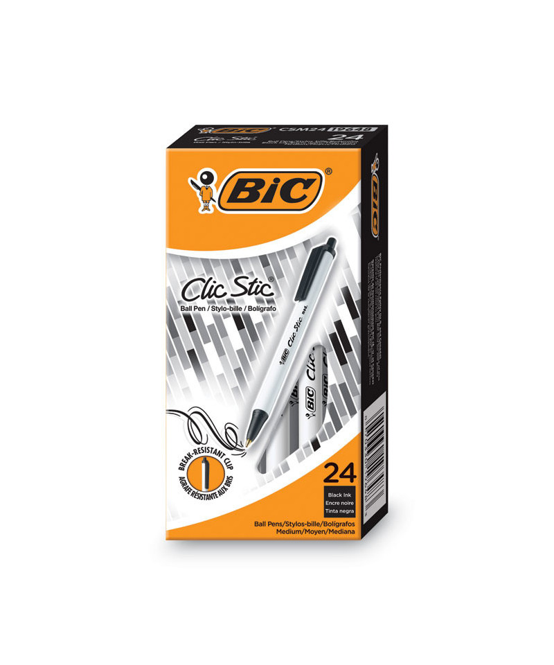 A BIC classic, the Clic Stic Ball Pen is convenient and affordable. This retractable ballpoint pen features a comfortable round barrel design ideal for all-day use. Its versatile medium point makes this pen a great choice for everything from list-making to note-taking. The break-resistant pocket clip makes it easy to bring the Clic Stic Ball Pen with you, wherever you go!