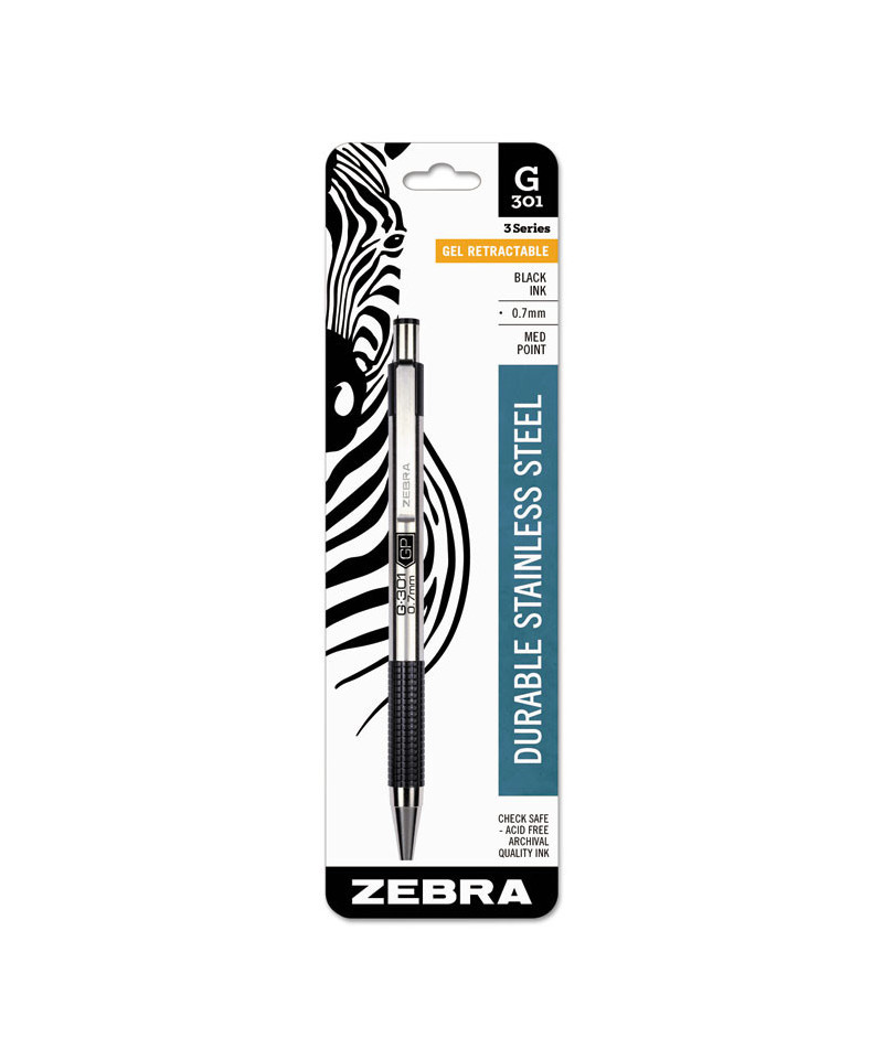 Zebra® Pen G-301® Retractable Gel Ink Pen is rugged, sleek, and easy to sanitize. This hard-working metal pen brings industry-leading precision and stability to your writing. The refillable G-301® has a sleek stainless steel barrel, metal plunge, clip and cone for an executive look. Corrosion resistant, stainless steel barrel is easier to sanitize than plastic. With its vibrant ink, the pen is perfect for everyday writing, document signatures and creative expression. Metal clip readily attaches to a notebook, planner, work bag or briefcase pocket. Impress your pen pal, up your bullet journal game or fill out your daily diary with a trusted, continually reliable writing experience. Clean and stylish, this trusted pen is suitable for boardrooms, courtrooms, classrooms, medical settings, offices and job sites. Enjoy the precision of a gel ink pen in your home and office writing without any of the drawbacks.
