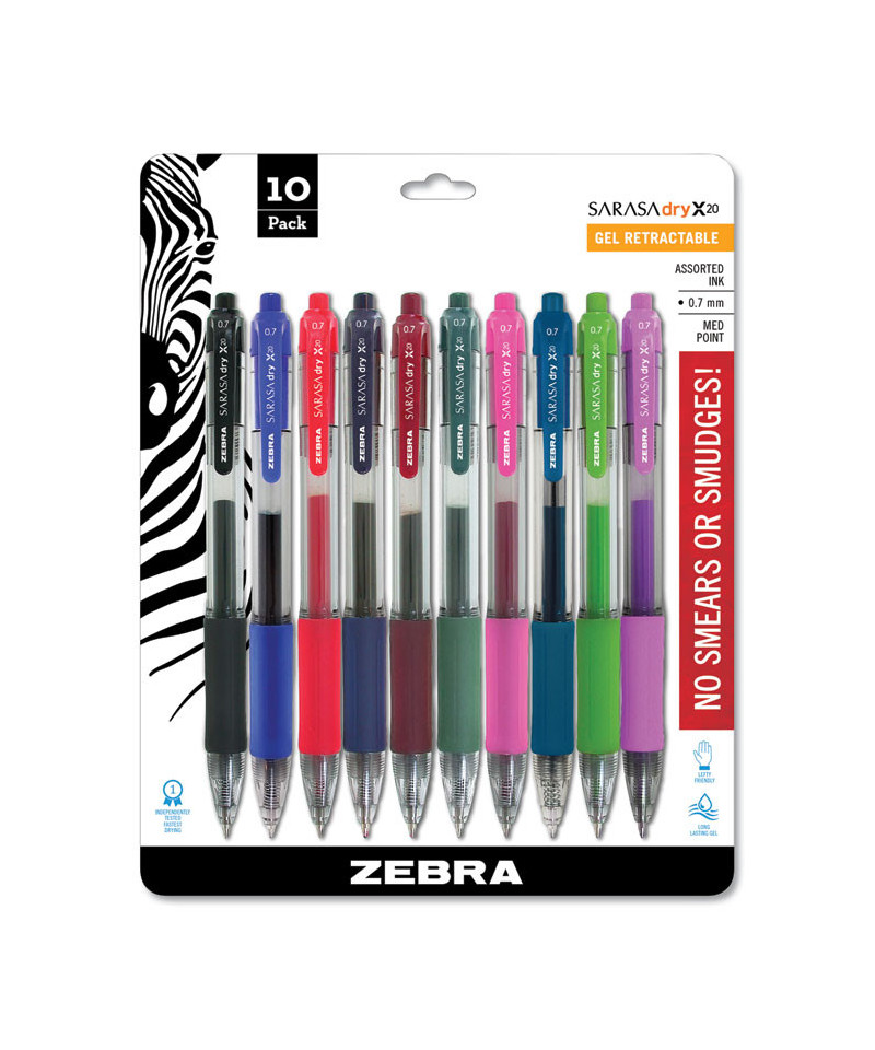 Enjoy a perfectly harmonized writing experience with the Sarasa X20 Premium Gel Ink Pens from Zebra! The innovative Rapid Dry Ink Technology not only allows a balanced continuous ink laydown, but is also proven to be the fastest drying gel ink available as well. This is an ideal pen for the left handed, as it eliminates smudging and smearing in seconds. Its soft rubberized grip is latex-free and it allows for a precise, yet comfortable and firm grip while writing on any surface. This premium ink gel pen creates a perfect harmony between smooth gel ink, fastest drying time, remarkably comfortable grip, retractable barrel and convenient pen clip for a trusted, continuously reliable writing experience. The Zebra Sarasa X20 Gel Pen is a perfect companion for any notebook, journal, calendar planner, teachers planning book, greeting cards and more. Pair this pen with other great writing instruments from Zebra.
