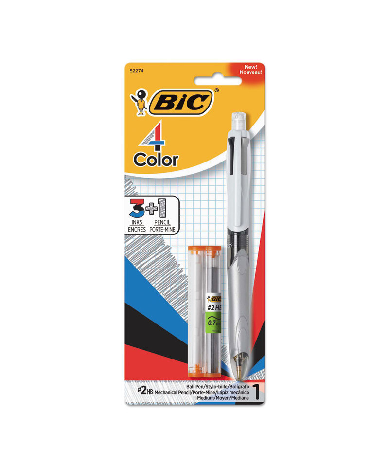 4-Color pen now includes a pencil! BIC 4-Color 3+1 Ball Pen and Pencil helps you have fun expressing your thoughts with three different ink colors—black, blue, and red—plus a 0.7 mm mechanical pencil equipped with #2 HB lead. Great for annotating or organizing your notes, this versatile writing instrument has a retractable design that lets you switch colors with an easy click. Each package includes 12 lead refills and five replacement erasers.