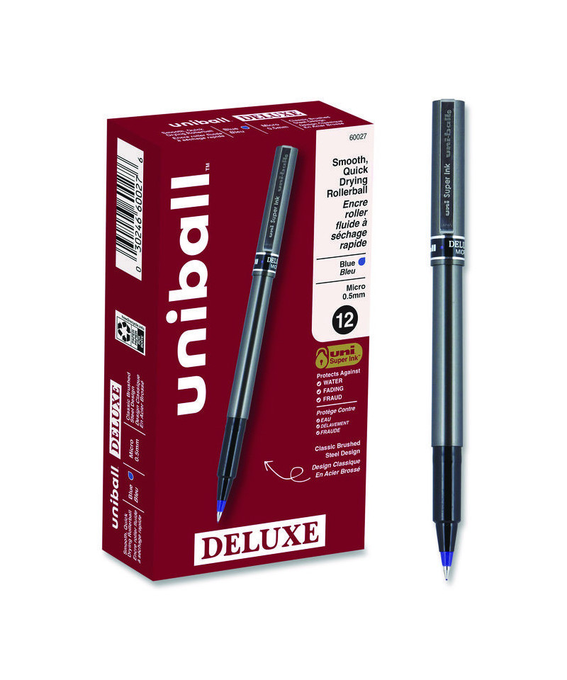 Introduce sophisticated style to your everyday writing with uniball® Deluxe Stick Roller Ball Pens. Even-flowing, acid-free liquid ink delivers intense, vibrant performance. Strong, precision tips render crisp lines with unparalleled definition, making it easy to create super fine details in your drawings and diagrams. uni Super Ink technology ensures their ink settles deep into paper for three-way protection against water, fading and fraud. Deluxe Stick Roller Ball Pens are also versatile, ideal for drawing, notetaking and more whether it's at work, in school or at home.