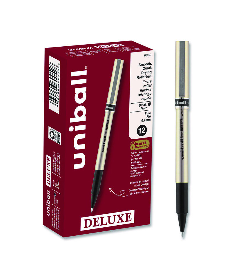 Introduce sophisticated style to your everyday writing with uniball® Deluxe Stick Roller Ball Pens. Even-flowing, acid-free liquid ink delivers intense, vibrant performance. Strong, precision tips render crisp lines with unparalleled definition, making it easy to create super fine details in your drawings and diagrams. uni Super Ink technology ensures their ink settles deep into paper for three-way protection against water, fading and fraud. Deluxe Stick Roller Ball Pens are also versatile, ideal for drawing, notetaking and more whether it's at work, in school or at home.