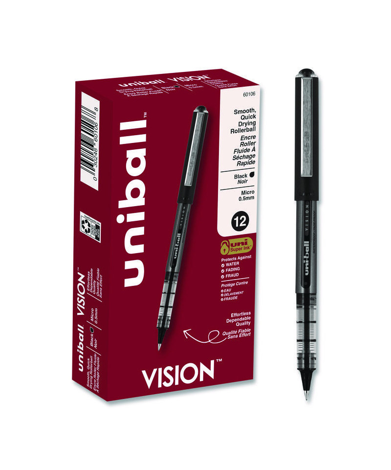 Make your everyday writing easy with the effortless and dependable performance of Vision Rollerball Pens from uni-ball featuring strong, long lasting tips. Capped roller pens deliver an even liquid ink lay-down for reliably smooth, vivid lines and a rich color for improved clarity and readability. Great for all writing tasks from taking notes to record keeping with archival quality, acid free roller ink. Innovative uni Super Ink technology forms an indestructible bond with the paper to minimize the risk of check washing or document fraud, while also protecting from water and fading. The exclusive Uni-Flow Ink System ensures a consistent, delightfully fluid writing experience, and a translucent window ensures that you don't run out of ink unexpectedly. Enjoy beautiful clean lines and give all of your ideas a burst of brilliant color with this classic style rollerball pen.