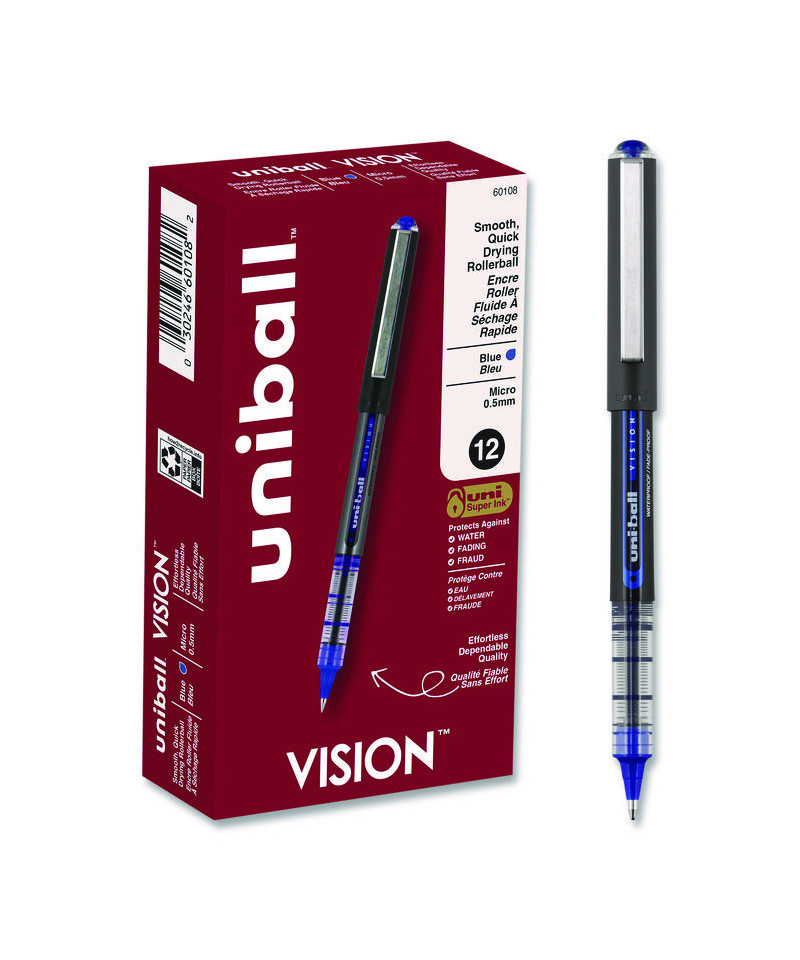 Make your everyday writing easy with the effortless and dependable performance of Vision Rollerball Pens from uni-ball featuring strong, long lasting tips. Capped roller pens deliver an even liquid ink lay-down for reliably smooth, vivid lines and a rich color for improved clarity and readability. Great for all writing tasks from taking notes to record keeping with archival quality, acid free roller ink. Innovative uni Super Ink technology forms an indestructible bond with the paper to minimize the risk of check washing or document fraud, while also protecting from water and fading. The exclusive Uni-Flow Ink System ensures a consistent, delightfully fluid writing experience, and a translucent window ensures that you don't run out of ink unexpectedly. Enjoy beautiful clean lines and give all of your ideas a burst of brilliant color with this classic style rollerball pen.