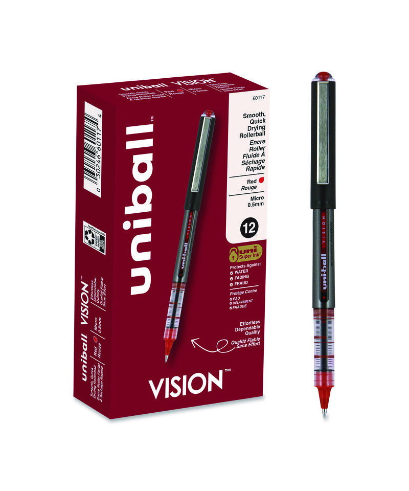 Make your everyday writing easy with the effortless and dependable performance of Vision Rollerball Pens from uni-ball featuring strong, long lasting tips. Capped roller pens deliver an even liquid ink lay-down for reliably smooth, vivid lines and a rich color for improved clarity and readability. Great for all writing tasks from taking notes to record keeping with archival quality, acid free roller ink. Innovative uni Super Ink technology forms an indestructible bond with the paper to minimize the risk of check washing or document fraud, while also protecting from water and fading. The exclusive Uni-Flow Ink System ensures a consistent, delightfully fluid writing experience, and a translucent window ensures that you don't run out of ink unexpectedly. Enjoy beautiful clean lines and give all of your ideas a burst of brilliant color with this classic style rollerball pen.