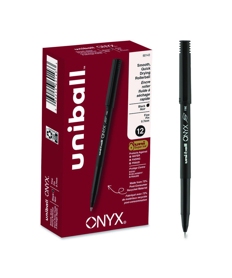 Stock your office, home or classroom with Onyx Rollerball Stick Pens from uni-ball featuring strong, long lasting tip sizes. This rollerball pen delivers the silky-smooth glide of a fountain pen without smudging for effortless writing. ONYX pens produce crisp and precise lines for intricate writing, making it easy to create super fine details in your drawings and diagrams. Capped roller pens are useful for a variety of tasks from note taking to signing checks and legal documents to uniquely embellishing fun and creative writing projects. Innovative uni Super Ink technology forms a strong bond with the paper, protecting from water, fading and fraud. A great economic and environmentally-conscious choice as this super sleek micro point roller pen is made from post-consumer recycled material.