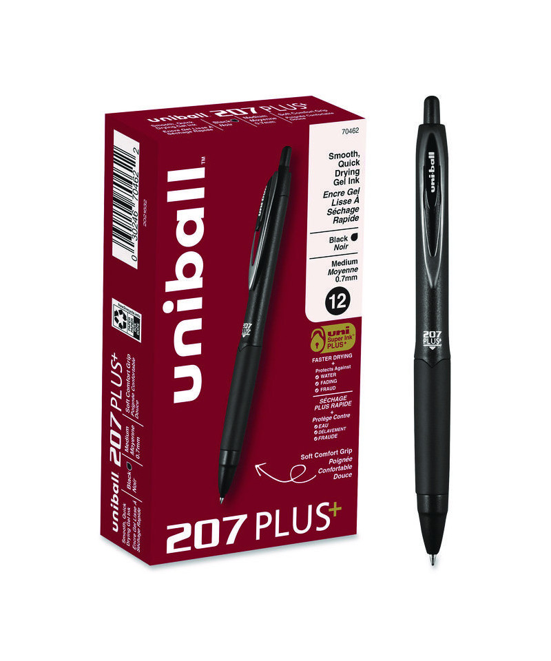 Take your writing to new heights with 207 Plus+ Retractable Gel Pens. Their precision point delivers rich, clean lines, and their advanced gel ink produces an enhanced smudge- and smear-free writing experience with exceptional smoothness, fast drying times and extra-bold line intensity, ensuring that every word you write stands out. Ideal for everyday writing tasks, jotting down notes and signing all of your important documents, Super Ink PLUS+ also entraps the gel in paper to produce fraud-, fade- and water-resistant documents that resist check-washing and bleaching. A seamless rubber grip provides a comfortable hold that helps you complete long writing projects with precise control. Refine your style with the sophisticated profile of 207 Plus+ gel pens.