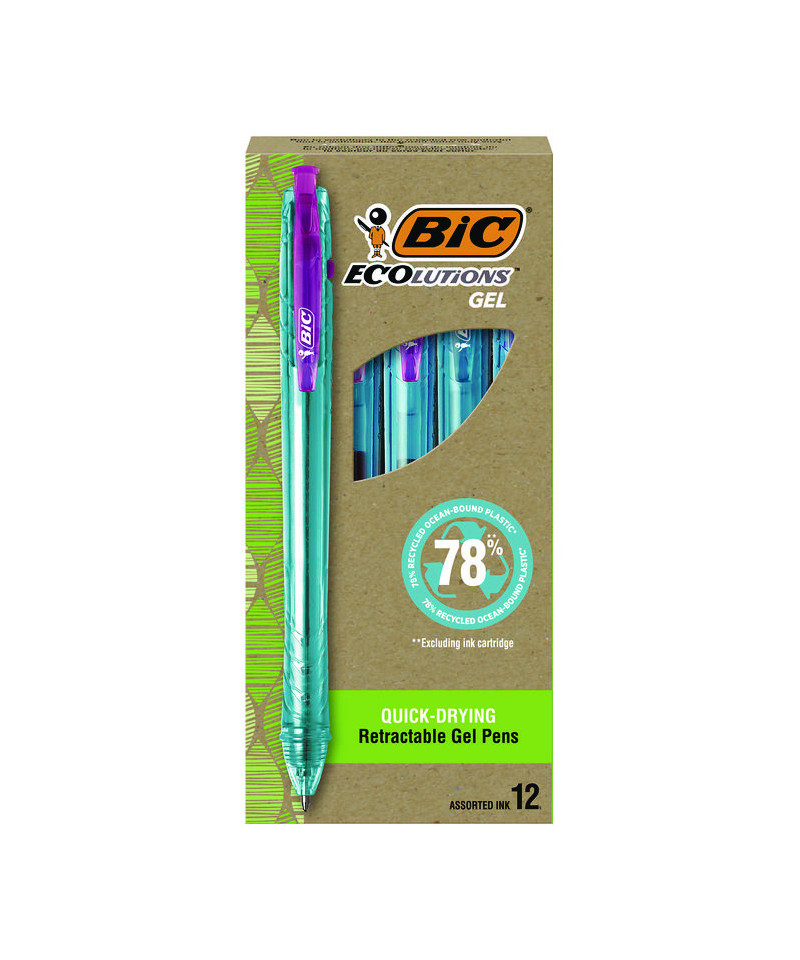 Help write our planet's future with the long-lasting BIC ECOlutions ocean-bound plastic retractable gel pen. This gel pen is made from 78% ocean-bound recycled plastic, excluding the ink cartridge, and the paperboard packaging is made from 100% recycled content and is recyclable. All the materials used are collected within 31 miles of a shore or waterway that leads to the ocean, preventing them from entering the ocean. With a medium 1 mm point, this is the perfect BIC pen for everyday writing. The smooth writing ink system delivers hours of effortless writing. The classic, slender, semi-clear barrel makes it easy to check ink levels. This pen is a smart choice for righties and lefties, as the vibrant ink dries quickly to prevent smearing. Designed for convenience, this retractable pen lets you start writing with just one click. Pick up the BIC ECOlutions ocean-bound plastic retractable gel pen for a high-quality, affordable writing utensil you can trust.