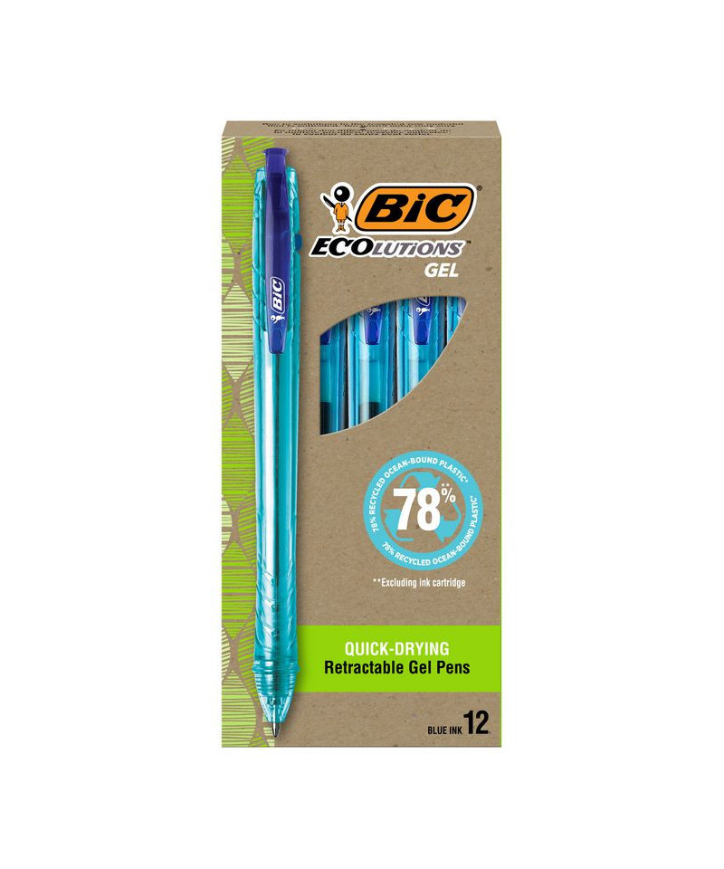 Help write our planet's future with the long-lasting BIC ECOlutions ocean-bound plastic retractable gel pen. This gel pen is made from 78% ocean-bound recycled plastic, excluding the ink cartridge, and the paperboard packaging is made from 100% recycled content and is recyclable. All the materials used are collected within 31 miles of a shore or waterway that leads to the ocean, preventing them from entering the ocean. With a medium 1 mm point, this is the perfect BIC pen for everyday writing. The smooth writing ink system delivers hours of effortless writing. The classic, slender, semi-clear barrel makes it easy to check ink levels. This pen is a smart choice for righties and lefties, as the vibrant ink dries quickly to prevent smearing. Designed for convenience, this retractable pen lets you start writing with just one click. Pick up the BIC ECOlutions ocean-bound plastic retractable gel pen for a high-quality, affordable writing utensil you can trust.