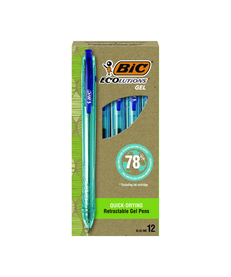 Help write our planet's future with the long-lasting BIC ECOlutions ocean-bound plastic retractable gel pen. This gel pen is made from 78% ocean-bound recycled plastic, excluding the ink cartridge, and the paperboard packaging is made from 100% recycled content and is recyclable. All the materials used are collected within 31 miles of a shore or waterway that leads to the ocean, preventing them from entering the ocean. With a medium 1 mm point, this is the perfect BIC pen for everyday writing. The smooth writing ink system delivers hours of effortless writing. The classic, slender, semi-clear barrel makes it easy to check ink levels. This pen is a smart choice for righties and lefties, as the vibrant ink dries quickly to prevent smearing. Designed for convenience, this retractable pen lets you start writing with just one click. Pick up the BIC ECOlutions ocean-bound plastic retractable gel pen for a high-quality, affordable writing utensil you can trust.