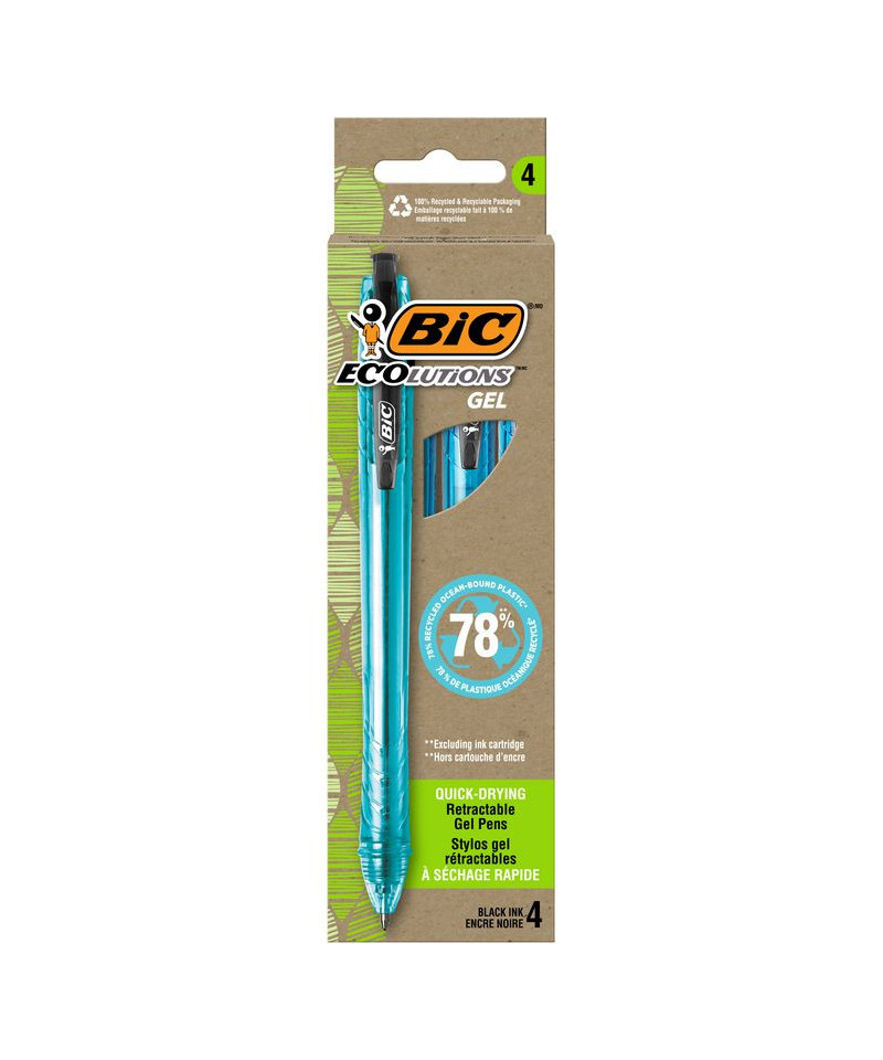Help write our planet's future with the long-lasting BIC ECOlutions ocean-bound plastic retractable gel pen. This gel pen is made from 78% ocean-bound recycled plastic, excluding the ink cartridge, and the paperboard packaging is made from 100% recycled content and is recyclable. All the materials used are collected within 31 miles of a shore or waterway that leads to the ocean, preventing them from entering the ocean. With a medium 1 mm point, this is the perfect BIC pen for everyday writing. The smooth writing ink system delivers hours of effortless writing. The classic, slender, semi-clear barrel makes it easy to check ink levels. This pen is a smart choice for righties and lefties, as the vibrant ink dries quickly to prevent smearing. Designed for convenience, this retractable pen let