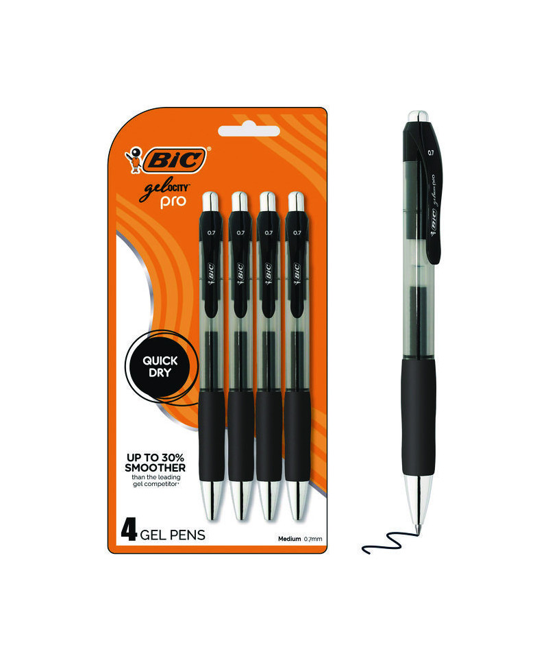BIC Gelocity Pro Black Gel Pens are your go-to choice for everyday writing. With a 0.7 mm medium point, these pens deliver clear, smear-resistant lines, making them perfect for jotting down notes, making lists, or any other writing tasks. The ink flows easily, providing a super smooth writing experience that's up to 30% smoother than the leading gel competitor. They're also a smart choice for left-handed writers, thanks to their smear-resistant ink. The round barrel features an ultra comfortable grip, allowing for a controlled yet comfortable hold, perfect for those long writing sessions. For added convenience, these pens are retractable and come with a plastic clip for easy attachment to pockets and notebooks. Choose BIC Gelocity Pro Ink Gel Pens for a reliable, high-quality writing tool. Individual smoothness may vary based on color. Dries in as little as five seconds.