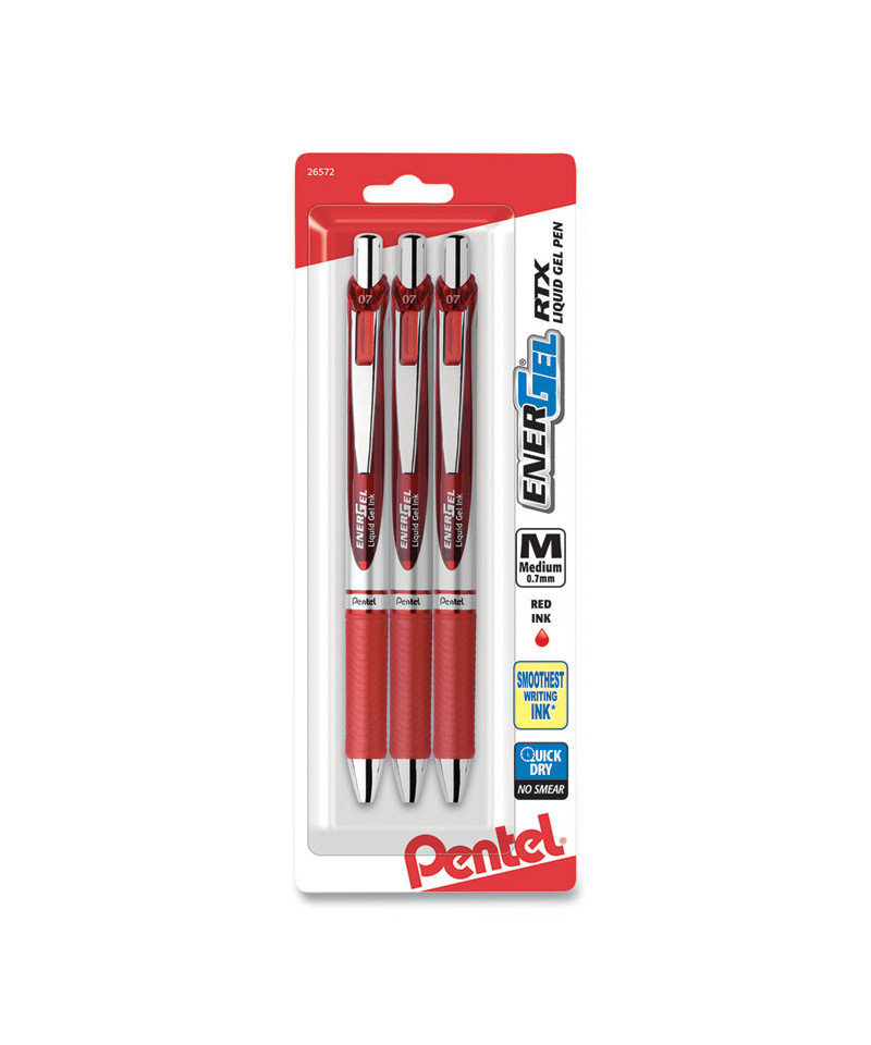 EnerGel RTX Gel Pen, Retractable, Medium 0.7 mm, Red Ink, Red/Gray Barrel, 3/Pack