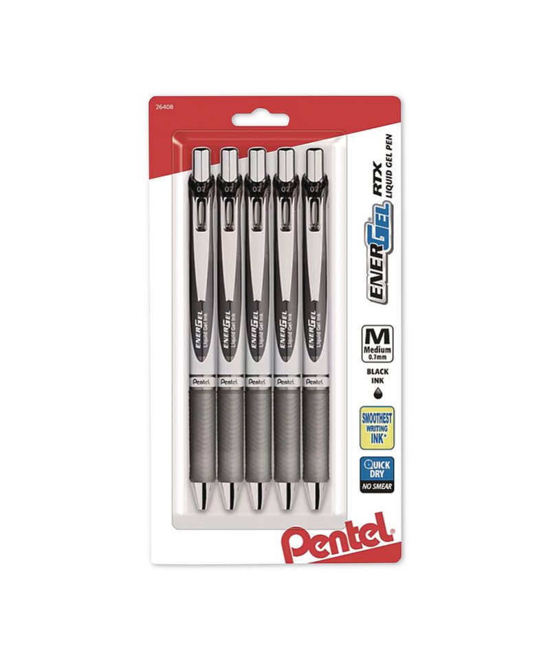 EnerGel RTX Gel Pen, Retractable, Medium 0.7 mm, Black Ink, Gray/Black Barrel, 5/Pack